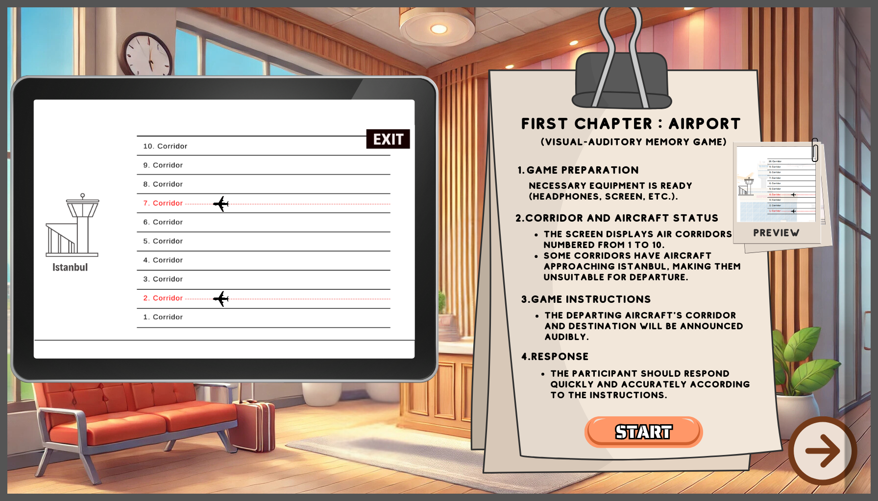 Bu testte, ekranda numaralandırılmış 10 hava koridoru göreceksin. İstanbul’dan kalkacak uçaklar için gelen işitsel talimatlarla hangi koridordan hangi şehre uçulacağını öğrenmen gerekiyor. Örneğin: “To Amsterdam on Corridor 8.”